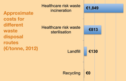 Putting non-risk waste incorrectly into the healthcare risk waste stream can cost your facility a lot of money! The graph below shows that it costs nearly €700 more per tonne to dispose of waste as healthcare risk waste, rather than as landfill waste. It costs over €1,000 more to dispose of waste as special healthcare risk waste.